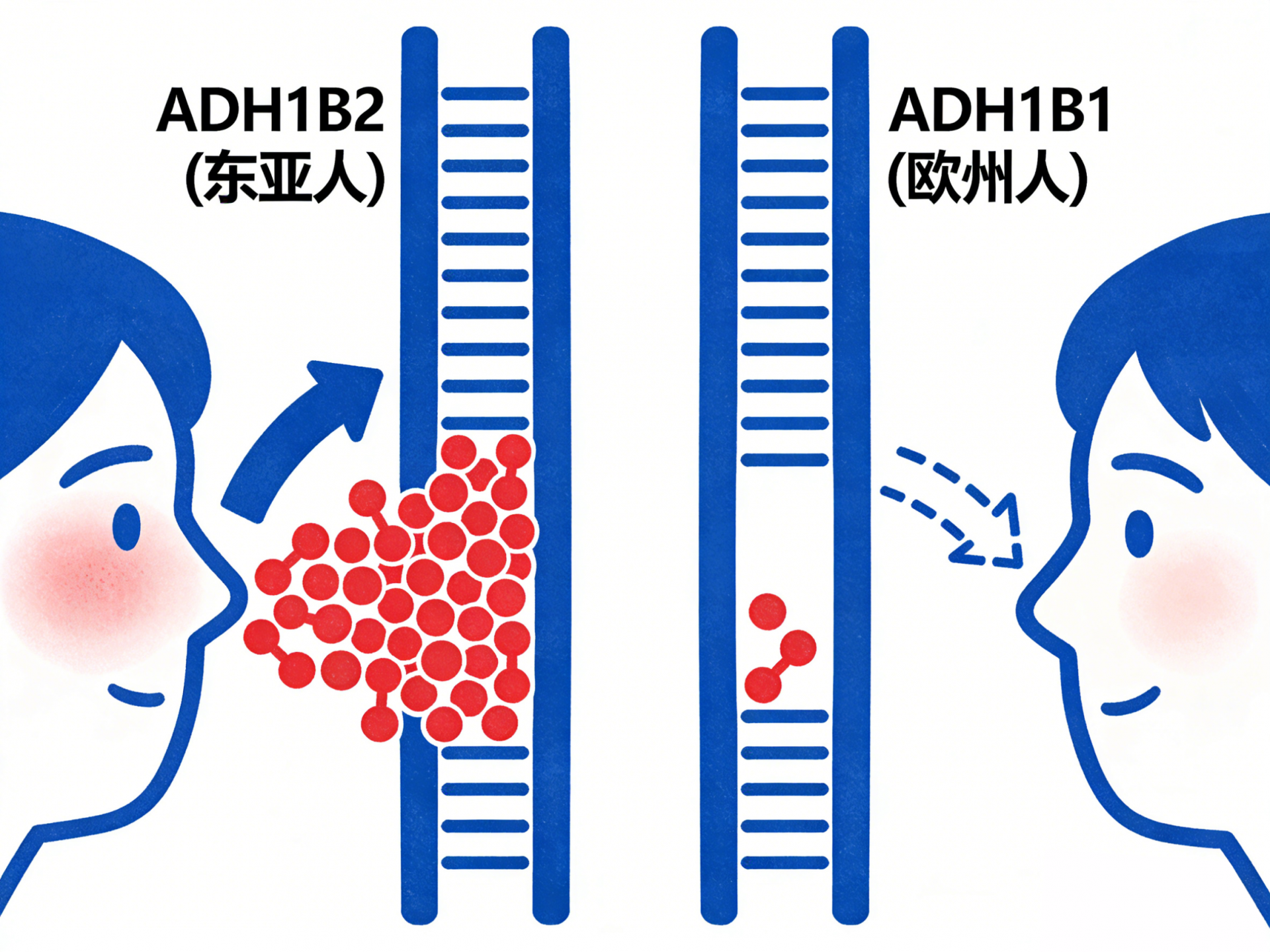 真正决定酒量的关键,是ALDH2基因。东亚人群中,大约30%到40%的人携带ALDH2*2突变基因。这种突变堪称代谢“刹车”,会让乙醛脱氢酶的活性几乎归零,乙醛根本无法被有效分解。这类人只要喝一点酒,乙醛就会在体内泛滥,除了脸红,还可能心跳快到像要蹦出来,甚至直接呕吐。